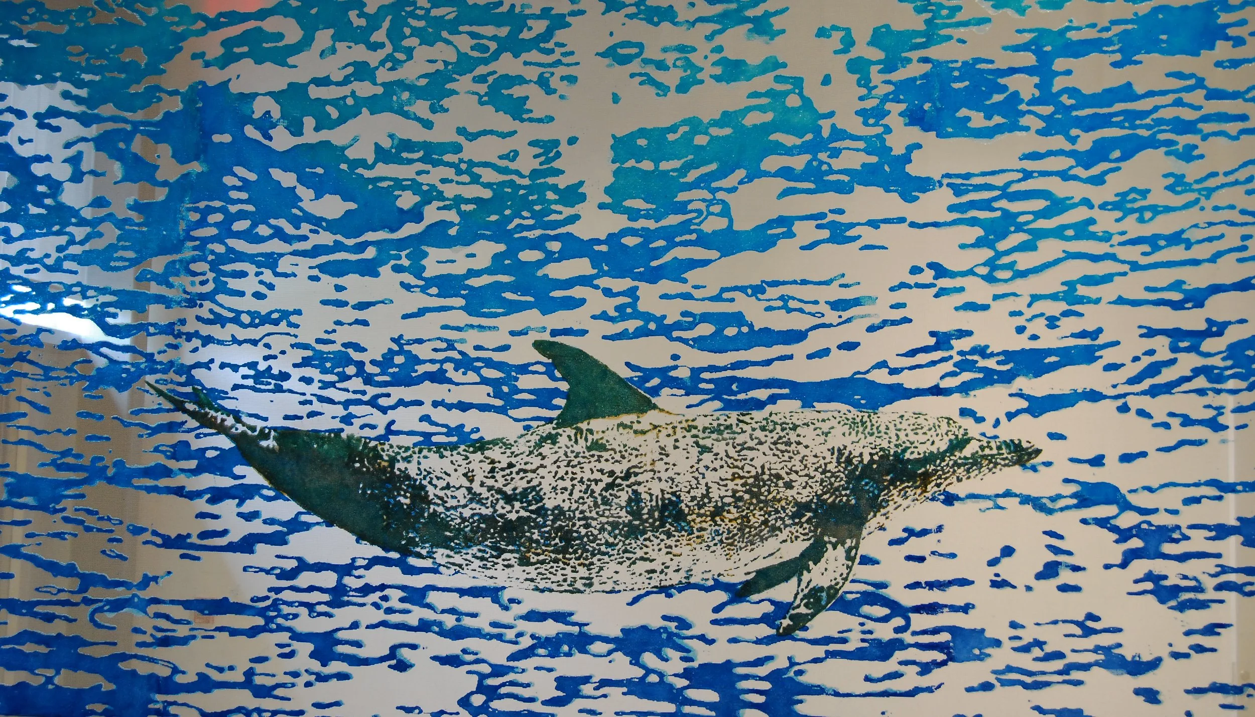 Through sculpture, sound, video, and print-based installation, Dead Air examined the aesthetics of scientific discovery, mythology, and colonial exploration, while drawing on science fiction and metaphysical inquiry. Bragg’s sculptural astronaut/diver hybrid and satirical drawings reflect the collapse of heroism and the imperial legacy of conquest. Holoweski’s sound work Ashes and video Food Shelter Clothing trace consciousness from the Big Bang to digital abstraction, evoking cyclical patterns of inquiry and invention. Smick’s large-scale print installation Stave My Soul features a lone dolphin floating beneath the ocean’s surface—prompting questions about non-human intelligence, reflection, and the anthropocentric lens through which we view other forms of life. Wu’s animated video The Last Subway presents a dreamlike narrative that shifts between real and virtual worlds, highlighting the influence of gaming and globalized media on identity and perception.