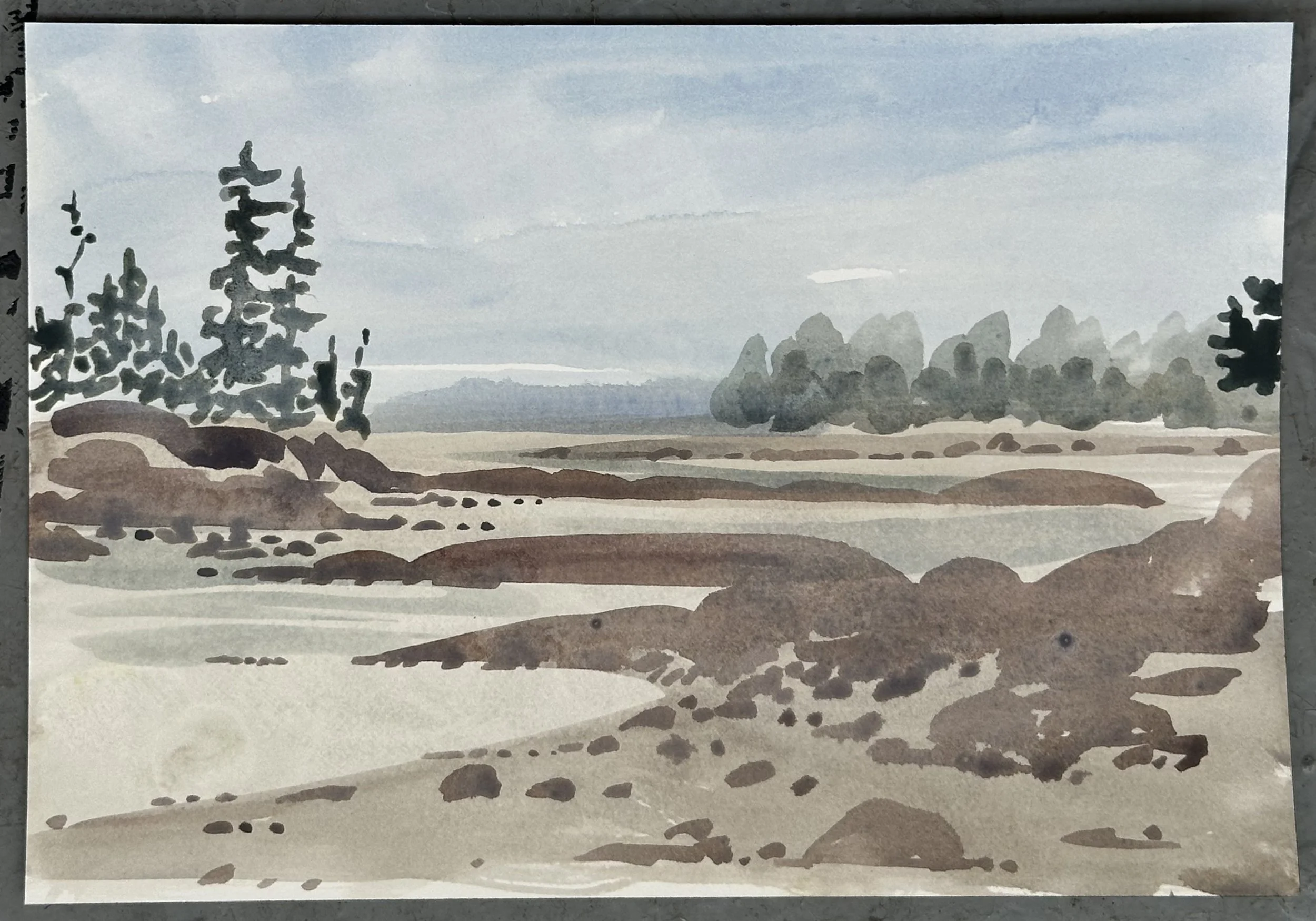 The watercolor paintings presented here are intimate, direct, and observational. They depict the coastline near Owl’s Head, Maine—a place of deep personal significance—and reflect a lifelong engagement with this landscape. I’ve returned to this shoreline since I was a boy, to a house my grandmother built, painting en plein air using watercolor to respond with immediacy to shifting light, weather, and tides. This body of work is rooted in attention and presence, and while it stands apart from my more process-driven installation work, it also informs it. The sensitivity to light, space, and layered transparency that defines these watercolors parallels many of the concerns I explore through more experimental means in the studio.